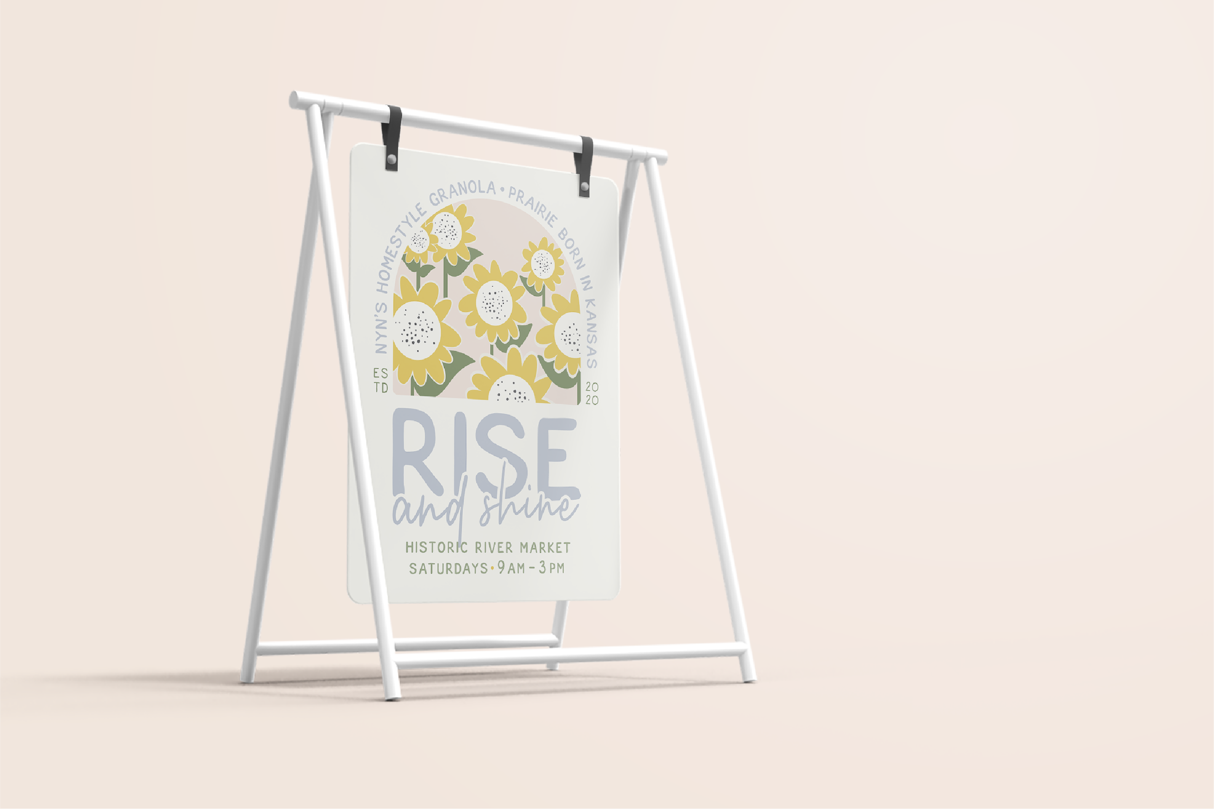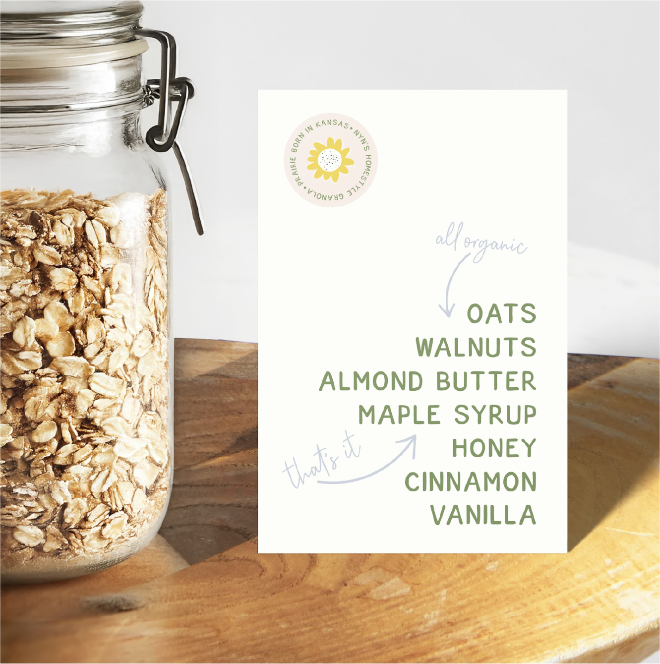 PROJECT GOAL: To design a warm and inviting brand that reflects Nyn’s Kansas roots and homemade, organic approach. The design aims to capture the simplicity and wholesomeness of Nyn’s gluten-free granola while highlighting her commitment to clean, quality ingredients and preparing her for success at local farmers markets.