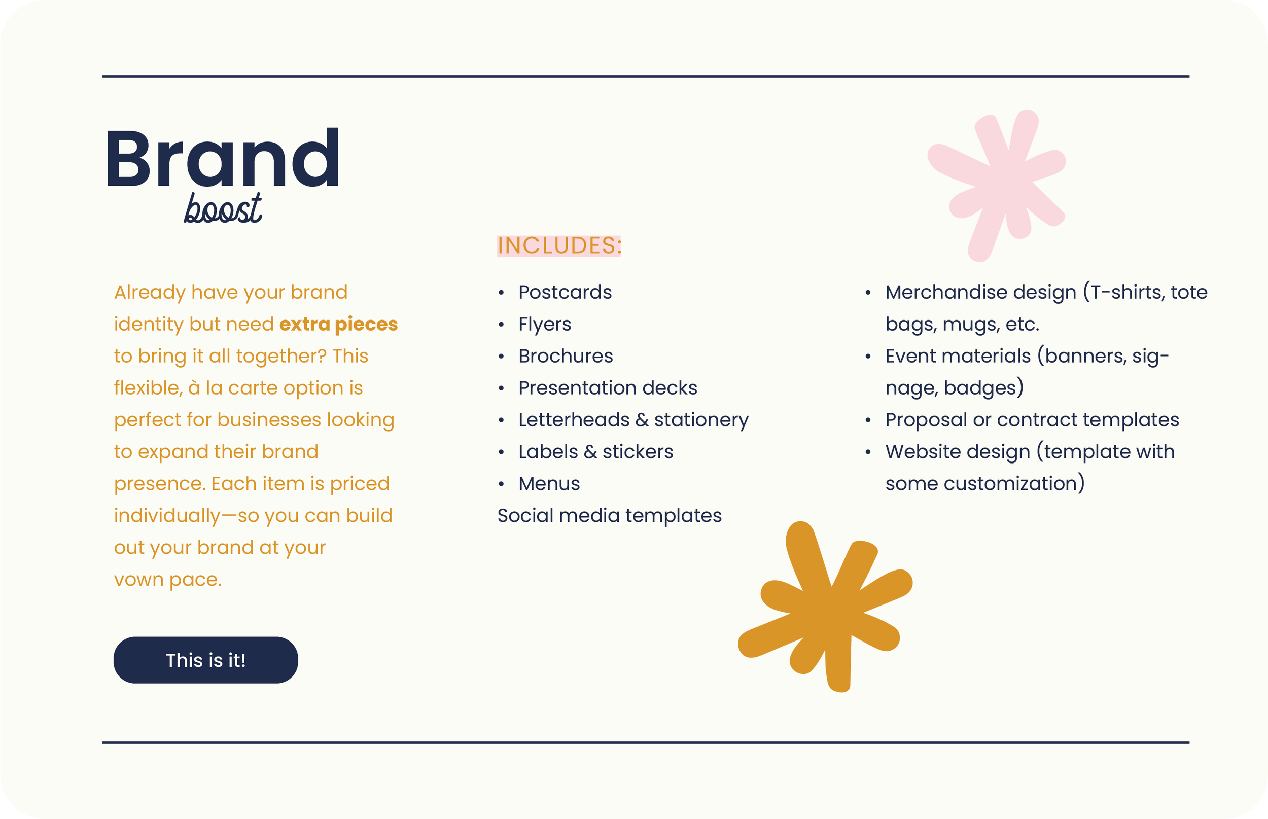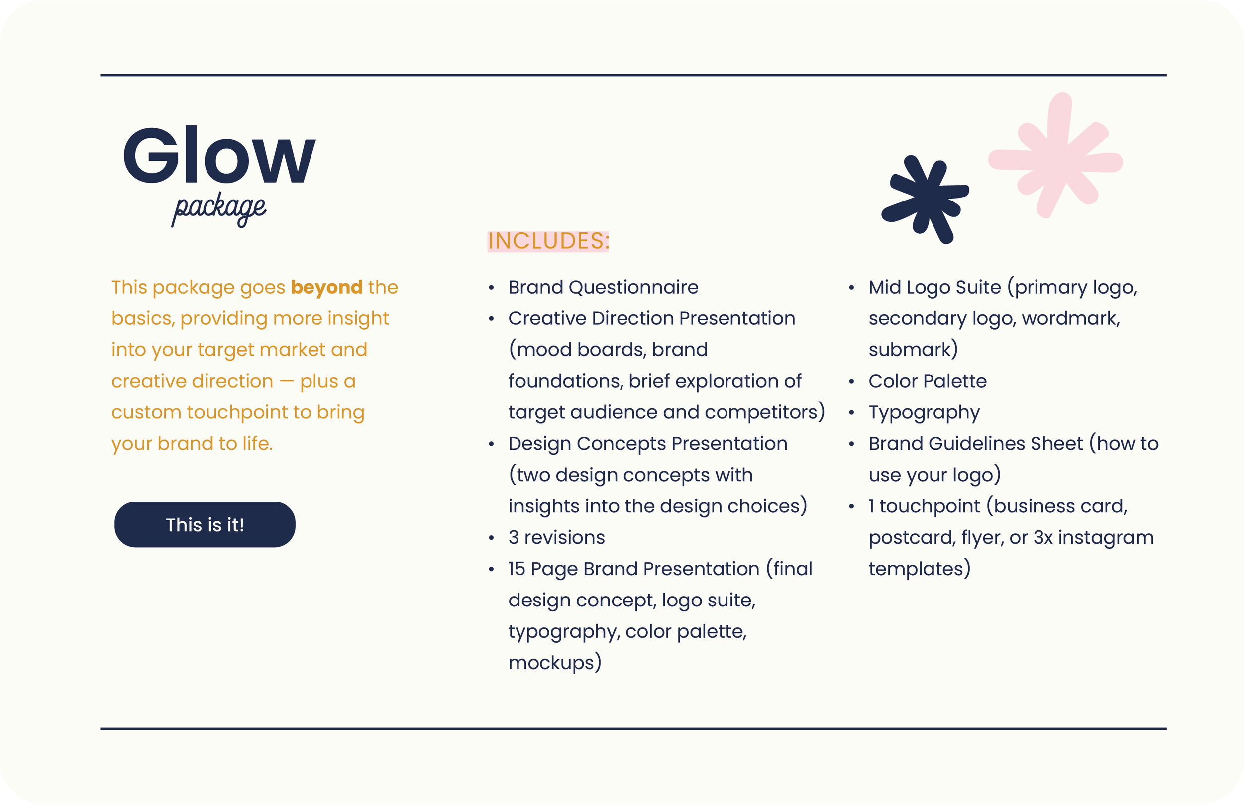 Scroll through my branding packages below! Whether you're starting fresh or ready to level up, each one has the tools you need to build a brand that feels authentic, consistent,